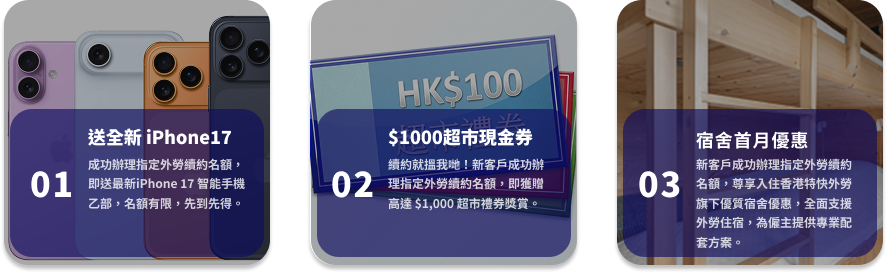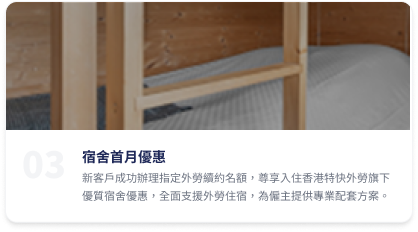 宿舍優惠適用於我們在全港 18 區管理的所有外勞宿舍,續約後首月租金即時減半,減輕僱主負擔。